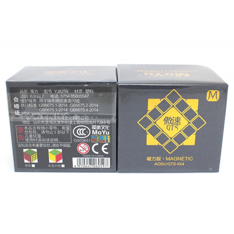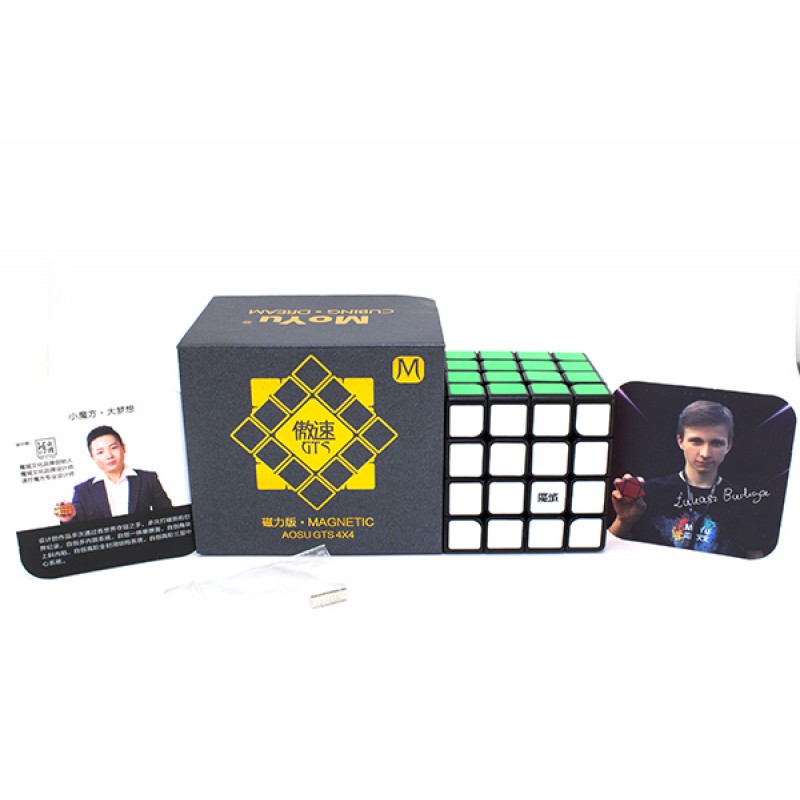 Головоломка существует в двух версиях пластика: черном и цветном. Отдельное внимание стоит уделить упаковке: ее стилю и дизайну. Коробочка магнитная и чем-то напоминает коробку от MoYu WeiLong GTS 2 M, которую тоже не стыдно поставить себе на полку. Комплектация у Аосу также схожа со «звездой трешек». Помимо куба и запасных магнитов там присутствуют карточки и инструкции, что, в общем-то, очень приятно.Выпуск Мою Аосу ГТС М произвел настоящую революцию, ведь это первый магнитный