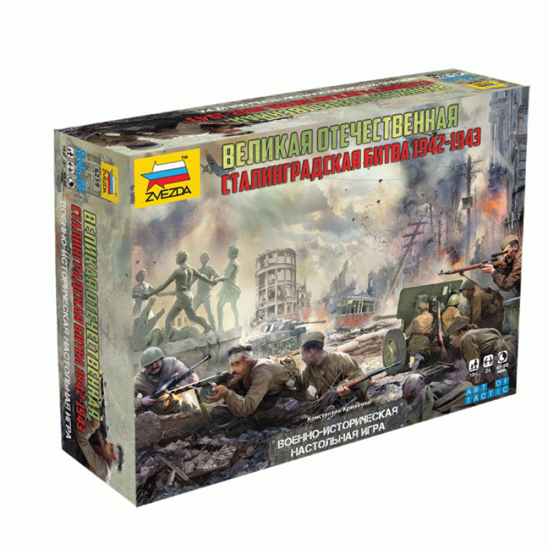 Настольная игра Великая отечественная. Сталинградская битва Стартовый набор. Игра "Сталинградская битва" посвящена событиям 1942-1943 годов, когда советские войска самоотверженно обороняли Сталинград от немецко-фашистских захватчиков. Битва за Сталинград, которая шла с 17 июня 1942 года по 2 февраля 1943 года, стала крупнейшим сражением за всю историю человечества. Разгром под Сталинградом немецких войск стал одним из переломных моментов в Великой Отечественной войне. Динамичные и захватывающие правила игры "Великая Отечественная" основаны на уникальной механике одновременного хода. Все игроки одновременно отдают приказы и одновременно выполняют их. Когда вы отдаёте приказы, вы не знаете, что в этот ход предпримет противник. Правила игры предоставляют игрокам множество возможных действий и при этом достаточно просты в освоении. Армии игроков состоят из высокодетализированных миниатюр, которые в точности соответствуют историческим прототипам. Новые игровые сценарии, основанные на исторических событиях, позволят вам погрузиться в атмосферу Сталинградской битвы.Состав игры: